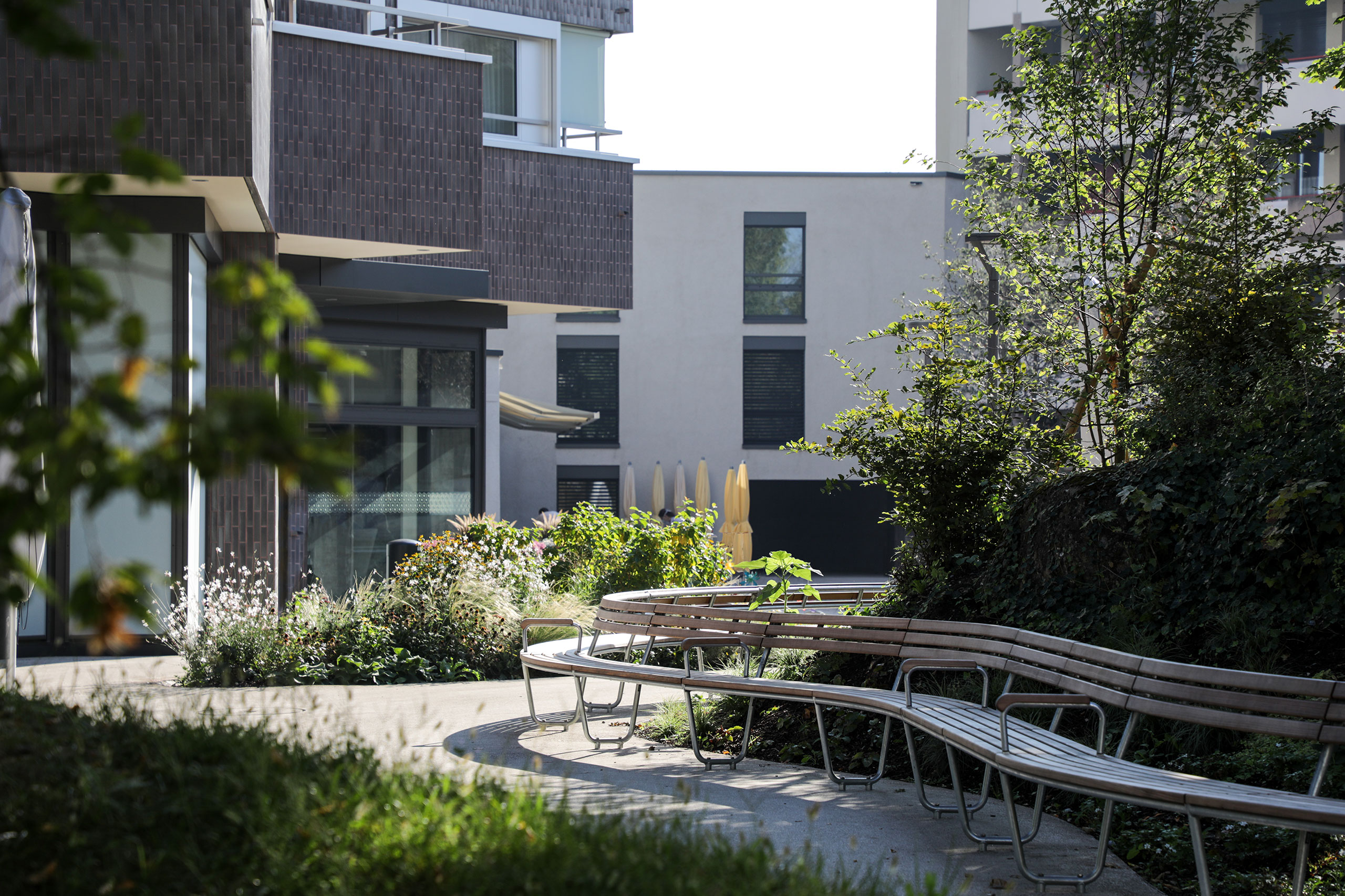 Eine sanft bewegte Platzfläche nimmt die Niveaudifferenz zwischen dem höhergelegenen Alterszentrum und dem tieferliegenden Eingang der Alterswohnungen auf und wird von neuen üppigen Blütenkissen und dem bestehenden, baumbestanden Hügel in ein Netz von Aufenthaltsbereichen mit unterschiedlichen Qualitäten gegliedert. Die Brunnenanlage von Charlotte Germann, ein Bodenrelief aus Faserzement, konnte am ursprünglichen Ort erhalten werden und schafft einen Kontrast zur üppigen Vegetation.