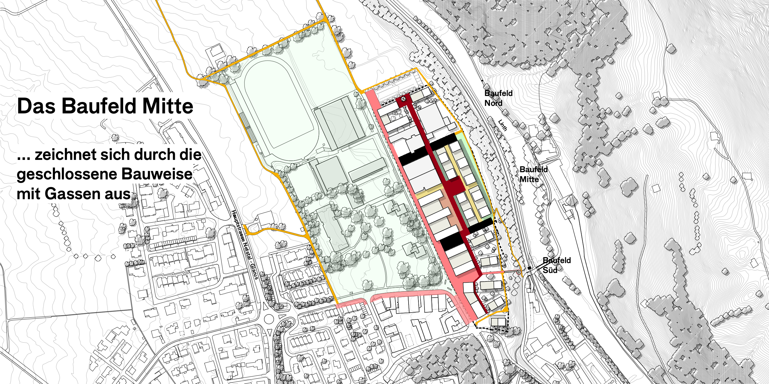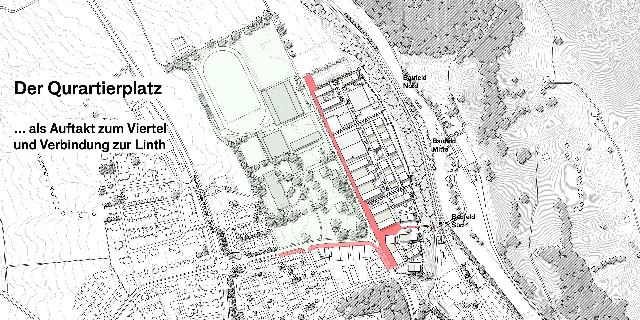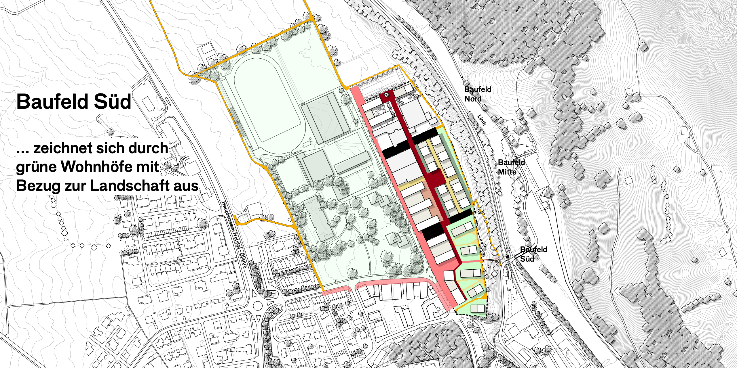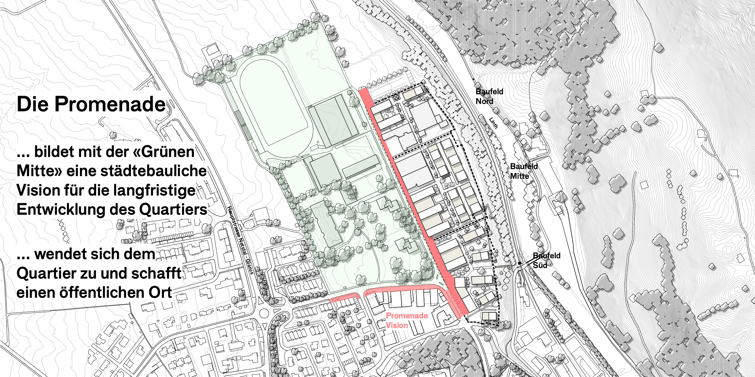 Das langgestreckte Areal wendet sich mit einer Promenade und den publikumsorientierten Erdgeschossnutzungen dem Quartier Buchholz zu und bildet einen klare Raumkante für die «Grüne Mitte». Die nicht publikumsorientierten Nutzungen richten sich nach Innen, zum Quartierweg, der die drei Baufelder untereinander verbindet. Dies stärkt das gesamte Quartier und die Begegnungs- und Aneignungsqualitäten der Freiräume. Im Baufeld Süd schafft der Quartierplatz einen angemessenen Auftakt zum Viertel und gleichzeitig einen Sichtbezug und eine direkte Fussverbindung zur Linth und dem angrenzenden Landschaftsraum.