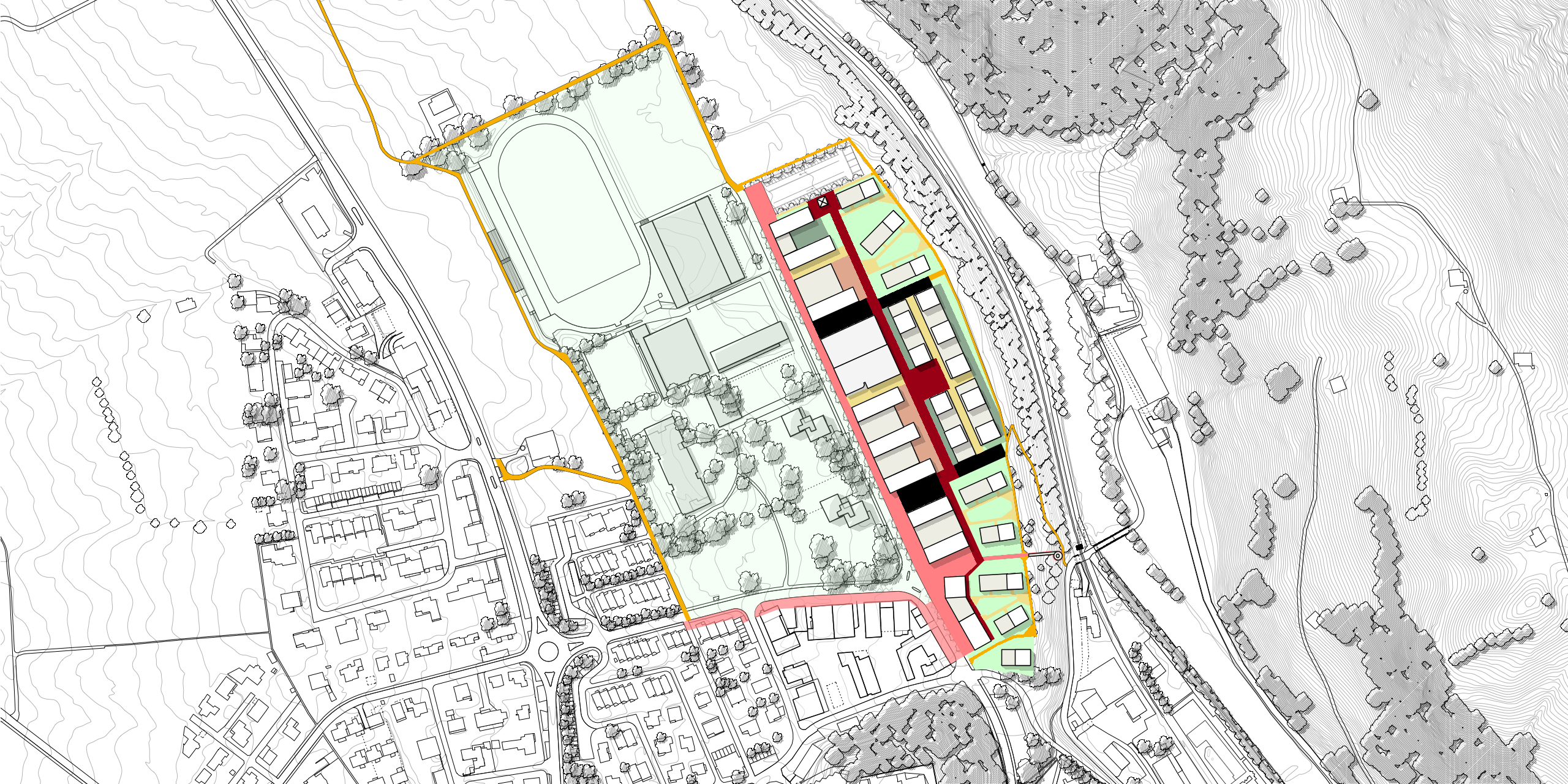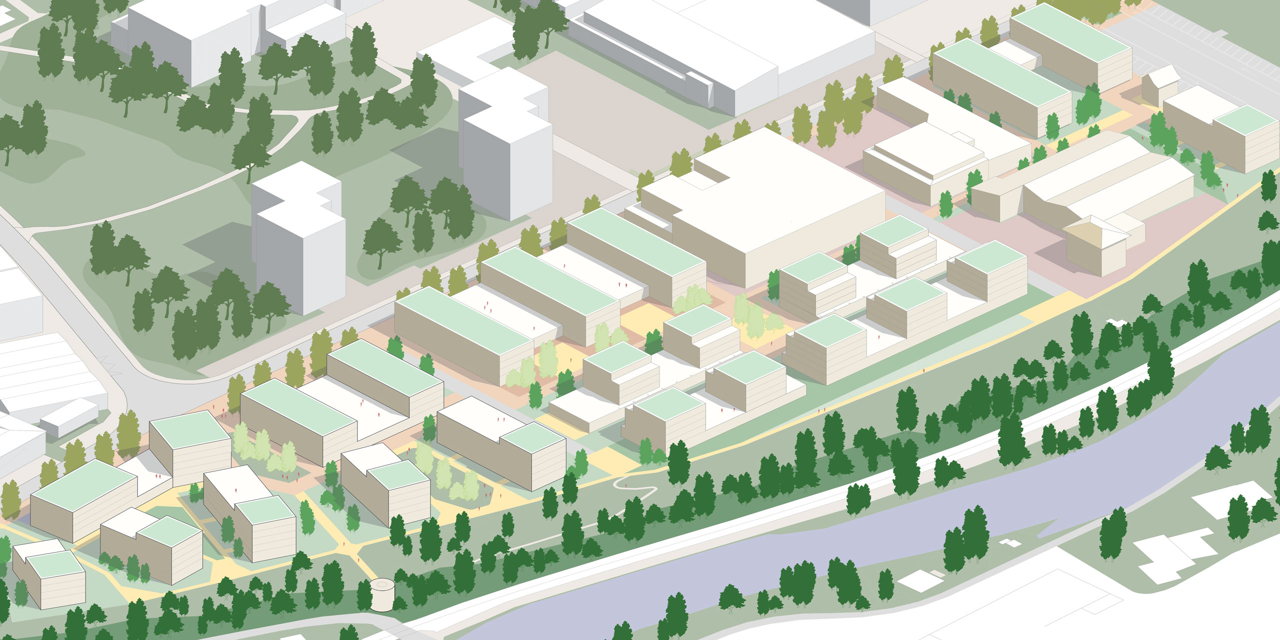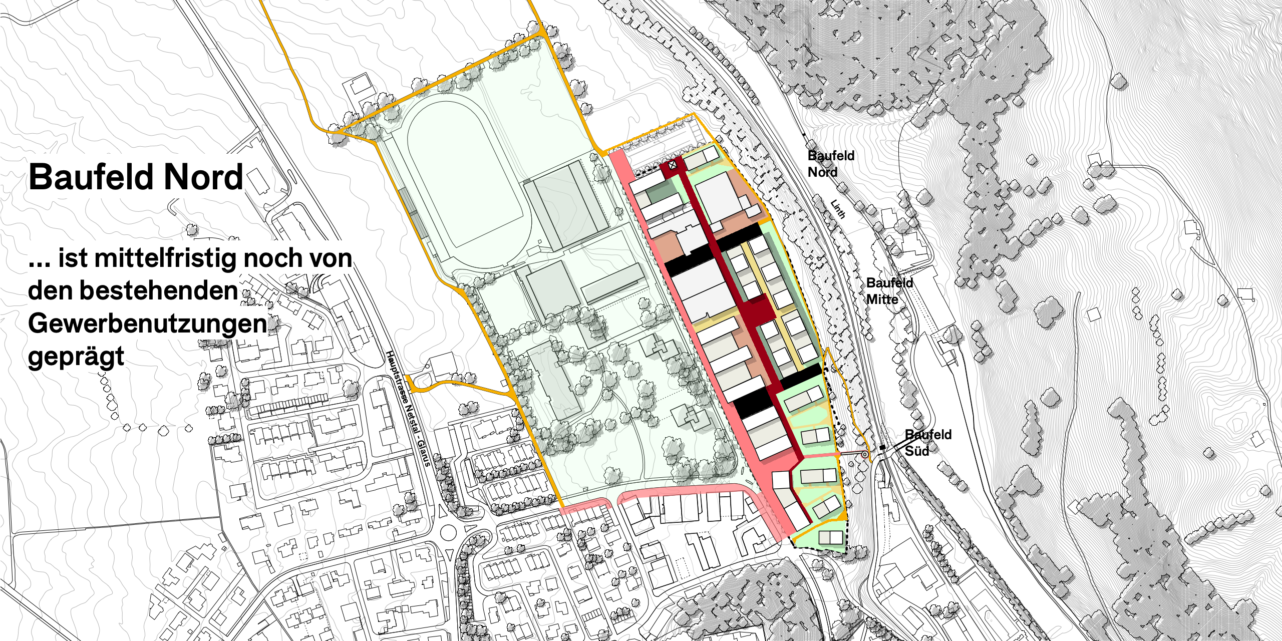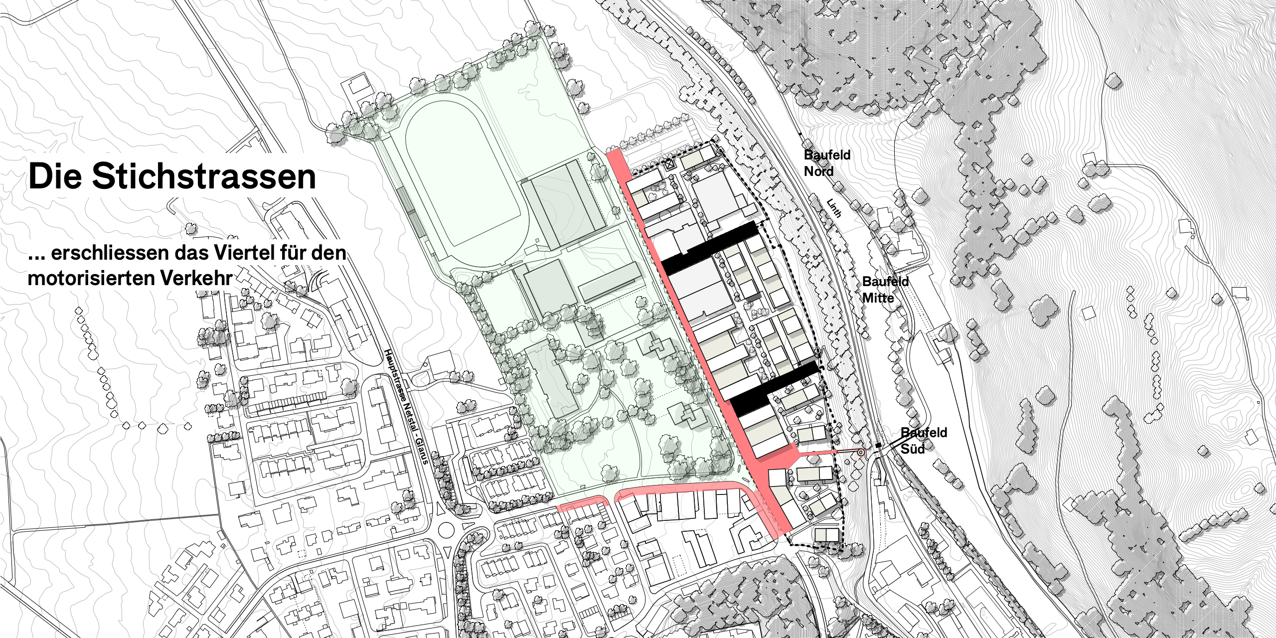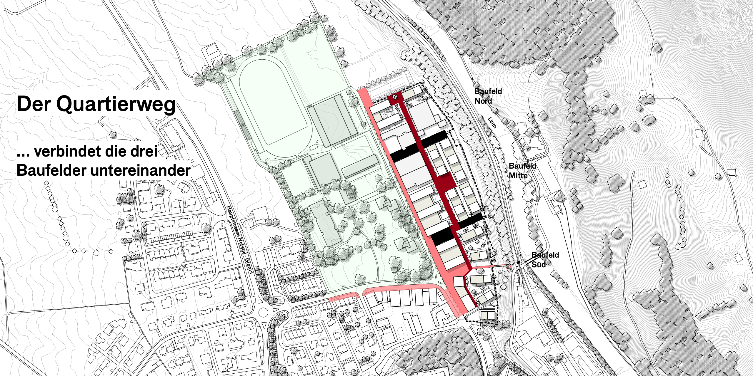 Das langgestreckte Areal wendet sich mit einer Promenade und den publikumsorientierten Erdgeschossnutzungen dem Quartier Buchholz zu und bildet einen klare Raumkante für die «Grüne Mitte». Die nicht publikumsorientierten Nutzungen richten sich nach Innen, zum Quartierweg, der die drei Baufelder untereinander verbindet. Dies stärkt das gesamte Quartier und die Begegnungs- und Aneignungsqualitäten der Freiräume. Im Baufeld Süd schafft der Quartierplatz einen angemessenen Auftakt zum Viertel und gleichzeitig einen Sichtbezug und eine direkte Fussverbindung zur Linth und dem angrenzenden Landschaftsraum.