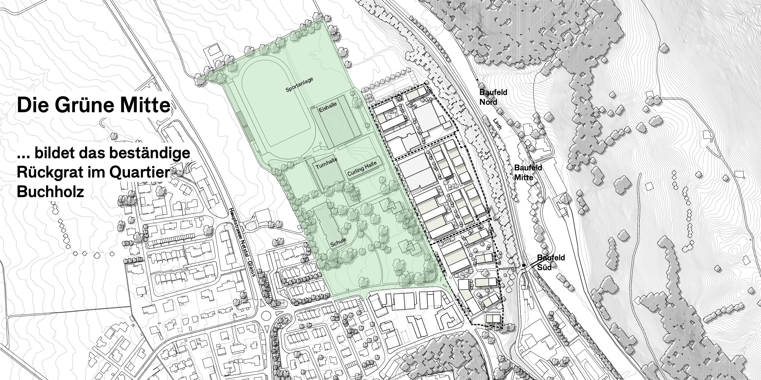 Das Gebiet Buchholz liegt am nördlichen Siedlungsrand von Glarus. Es ist vom Sonnenhügel räumlich vom Stadtzentrum abgetrennt und wird heute nicht als Quartier wahrgenommen. Es besteht aus unterschiedlichen und zusammenhangslosen Bereichen. Langfristig ist neben der geplanten Transformation des Gewerbeareals Buchholz mit weiteren Umnutzungen im Gebiet Buchholz zu rechnen. Die bauliche Entwicklung auf dem Areal Buchholz soll die Identität des Quartiers stärken und es zu einem lebendigen Wohnquartier in Glarus werden lassen. Mit der «Grünen Mitte» wird eine städtebauliche Vision für das gesamte Quartier Buchholz vorgeschlagen, die eine Neuinterpretation des vorhanden Grünraums aufzeigt, das Areal Buchholz ins Quartier einbindet und auch wegweisend für zukünftige Entwicklungen sein kann.