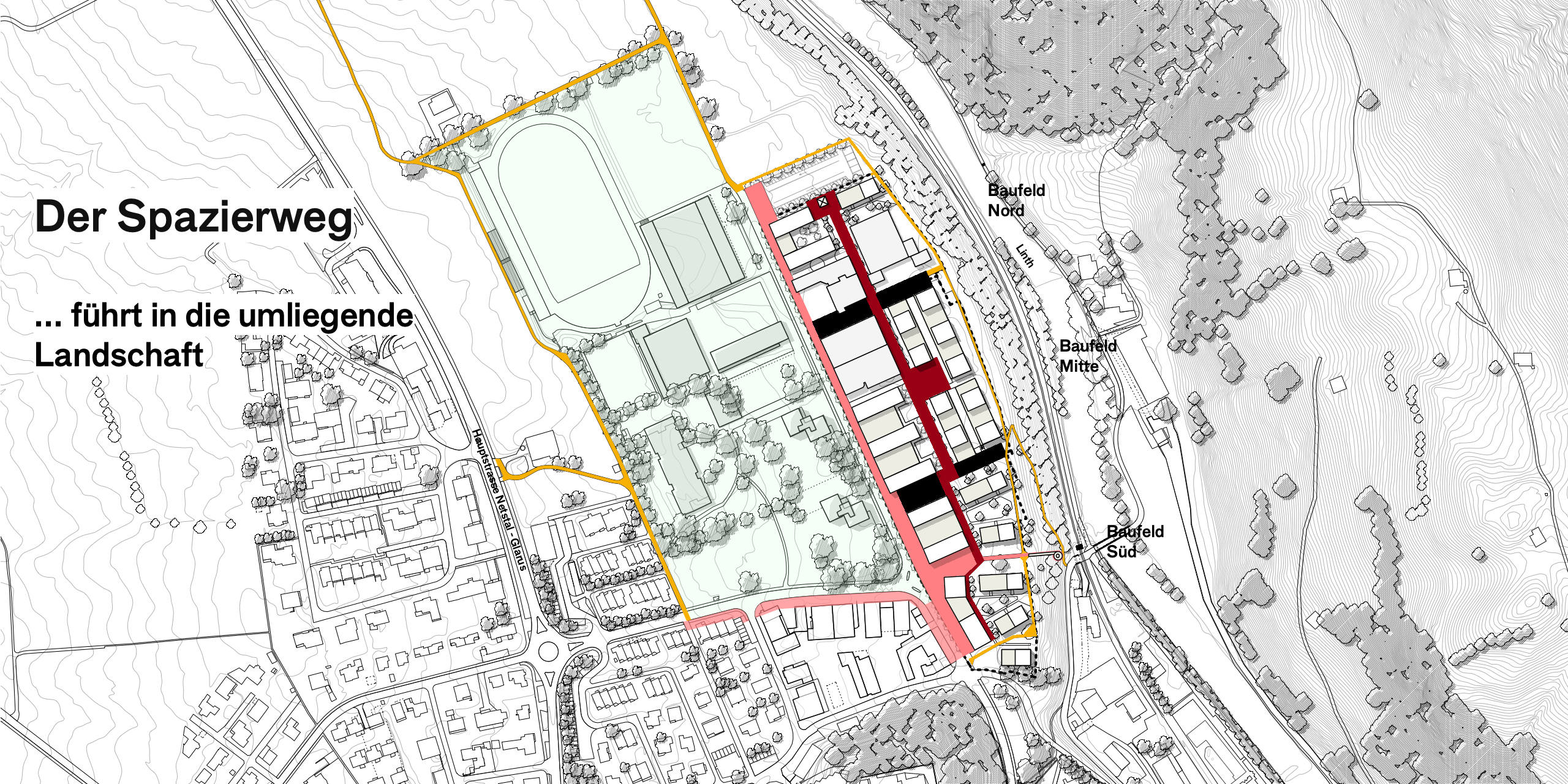 Mit der Differenzierung von offener und geschlossener Bauweise über die drei Baufelder erhalten die Aussenräume spezifische Atmosphären und Qualitäten. Während sich das Baufeld Mitte durch introvertierte Gassen und Hofräume auszeichnet, sind die Baufelder Süd und Nord (langfristig) durch die Bezüge zum angrenzenden Landschaftsraum geprägt. Ein kleiner öffentlicher Panoramaweg führt entlang der Böschungskante zur Linth um das Quartier und schliesst das Wegenetz des neue Viertels.