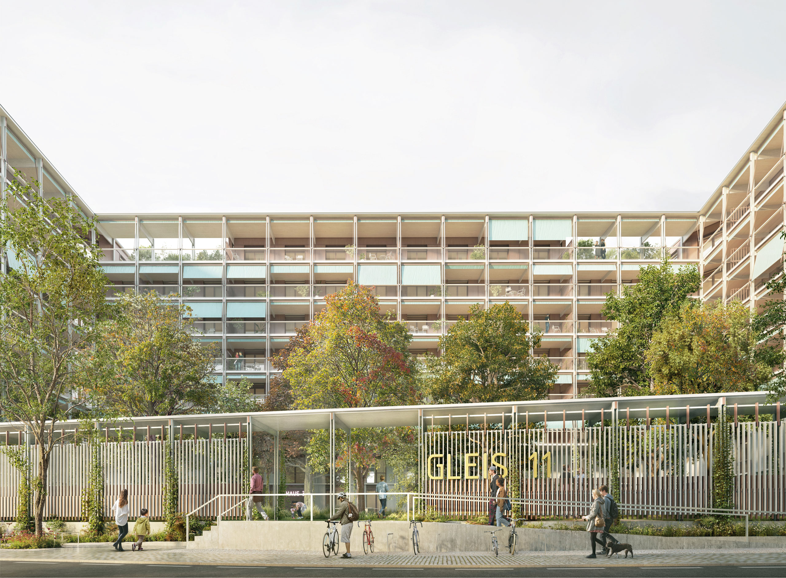 Der Gartenhof bildet die Adresse der Wohnungen an der Zuchwilerstrasse. Über die Vorzone mit Baumreihe und Vorgartenvegetation betritt man den Garten, der zur Strasse hin von einer grünen Laube gefasst wird und mit seiner üppigen Vegetation, offenen und geschlosseneren Bereiche vorsieht, die Raum für nachbarschaftlichen Austausch in einer grünen Oase im städtischen Umfeld bieten. Ein lebendiges Spiel aus Licht und Schatten schafft abwechslungsreiche Aufenthaltsorte und vermag den Atelierwohnungen, die an die Hoffläche anschliessen, private Aussenräume in der Balkonschicht anzubieten, die vom Ausblick ins Grüne profitieren. Die Kita orientiert sich nach Aussen. Ihr Freiraum wird von einem Vegetationssaum mit umlaufender Mauer gefasst und ermöglicht den Kindern ungestörtes Spielen im kühlen Garten.