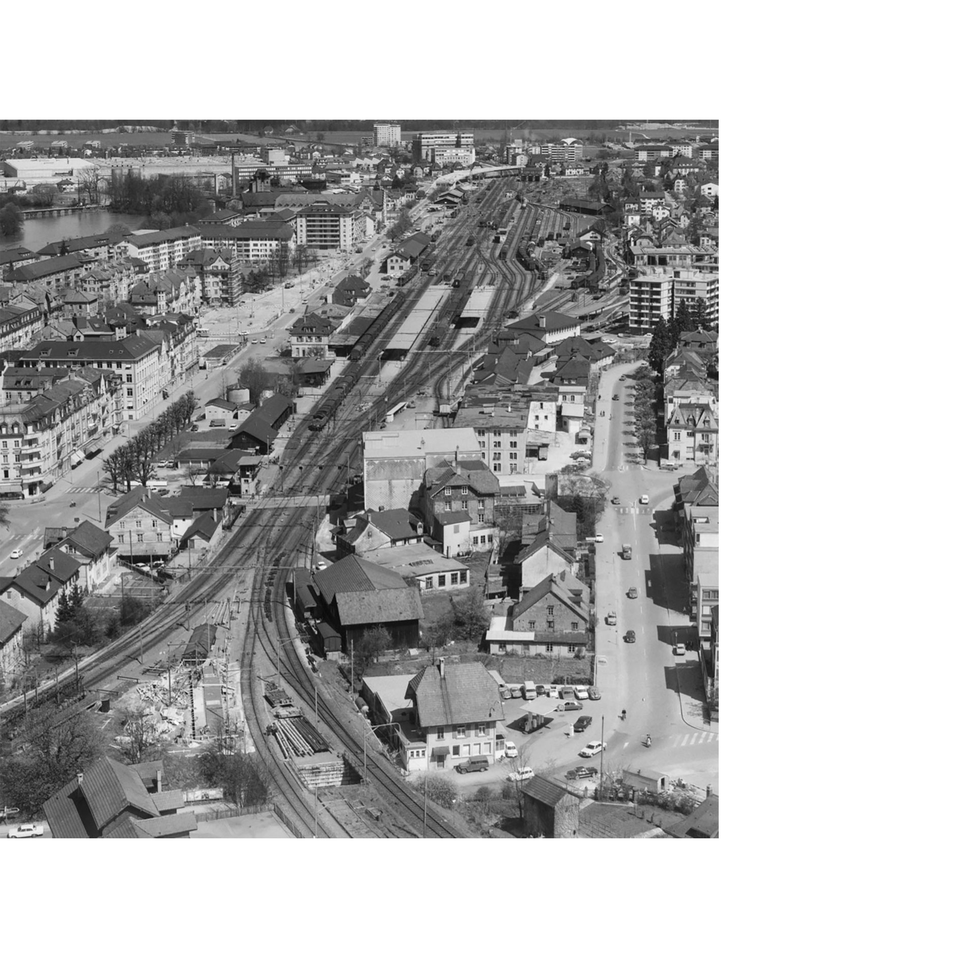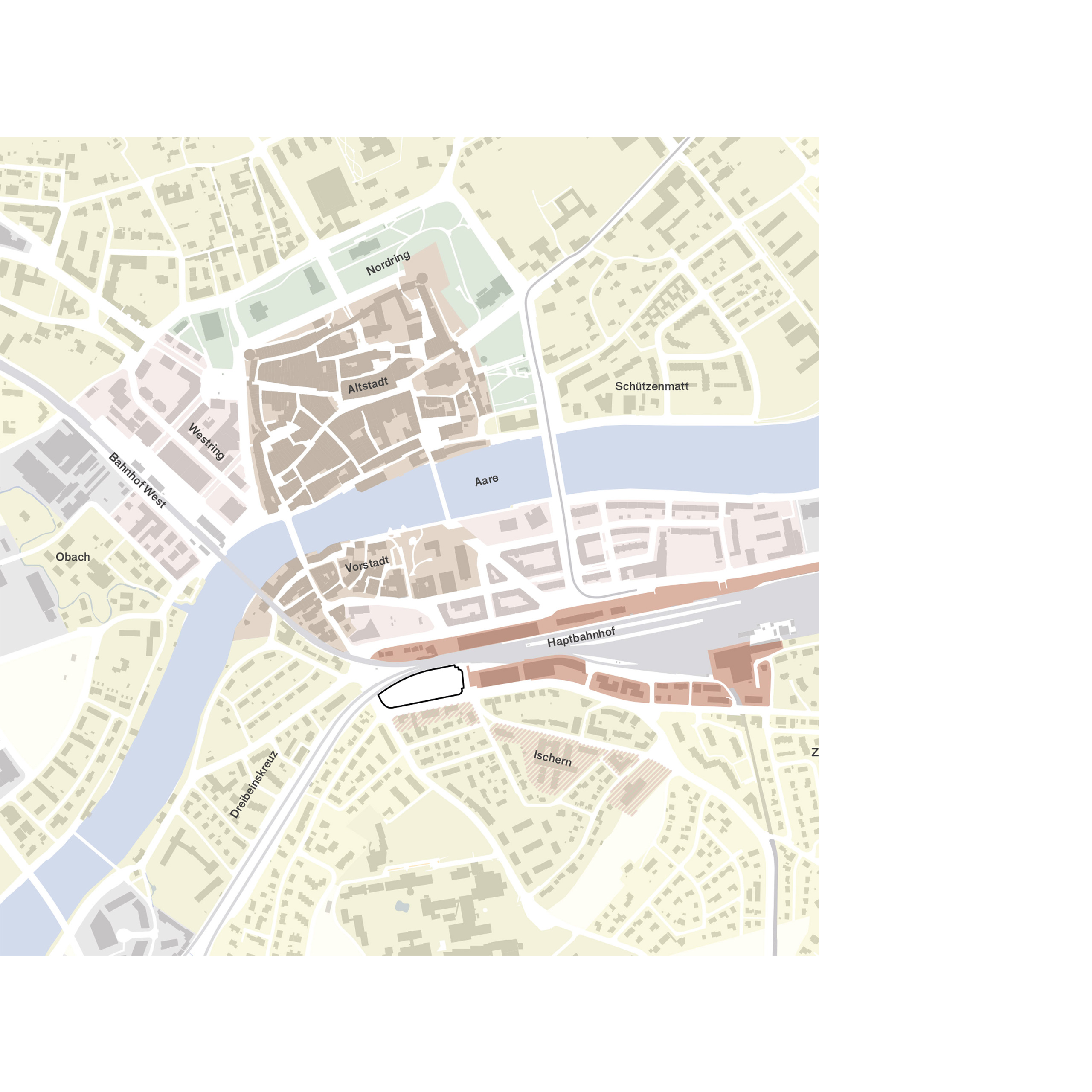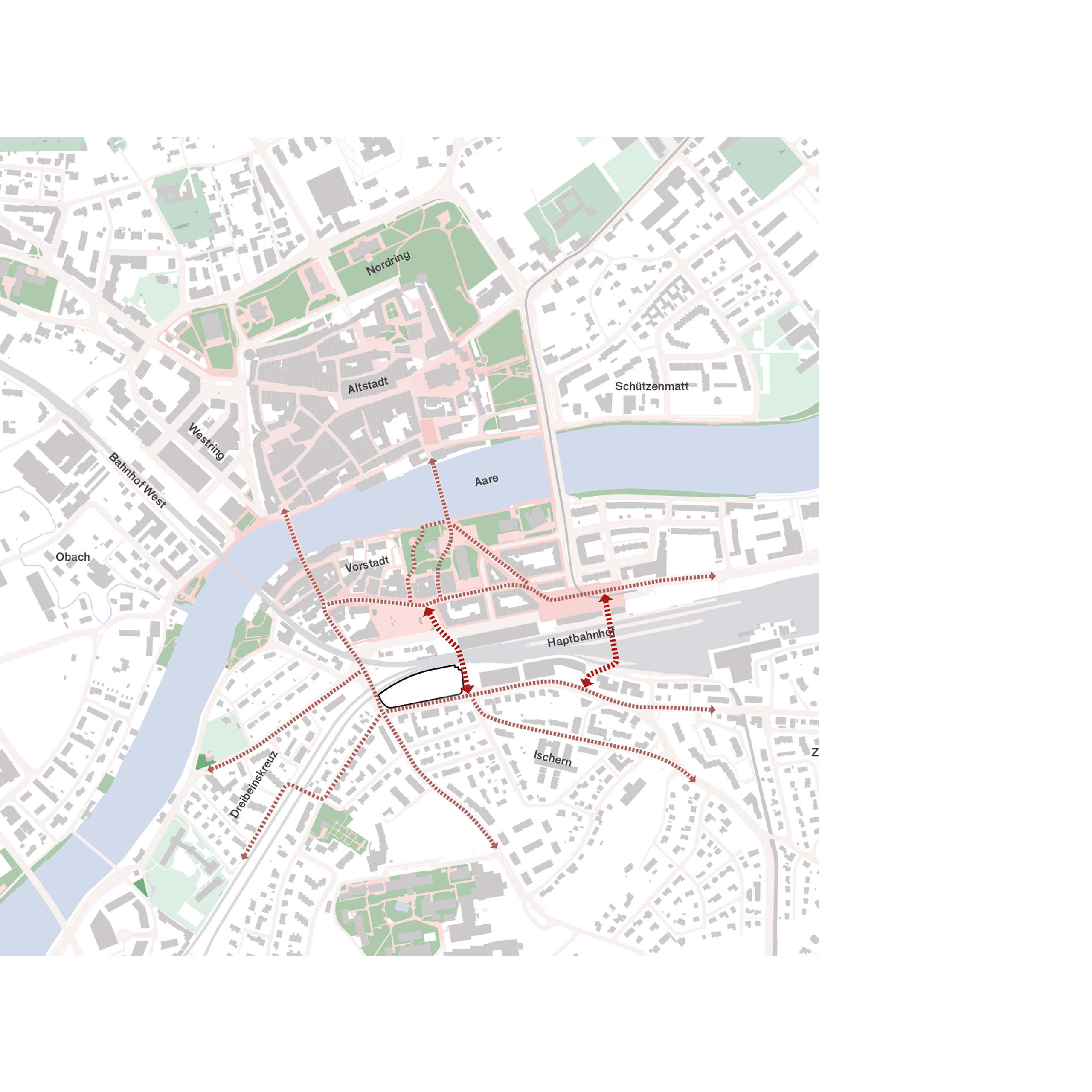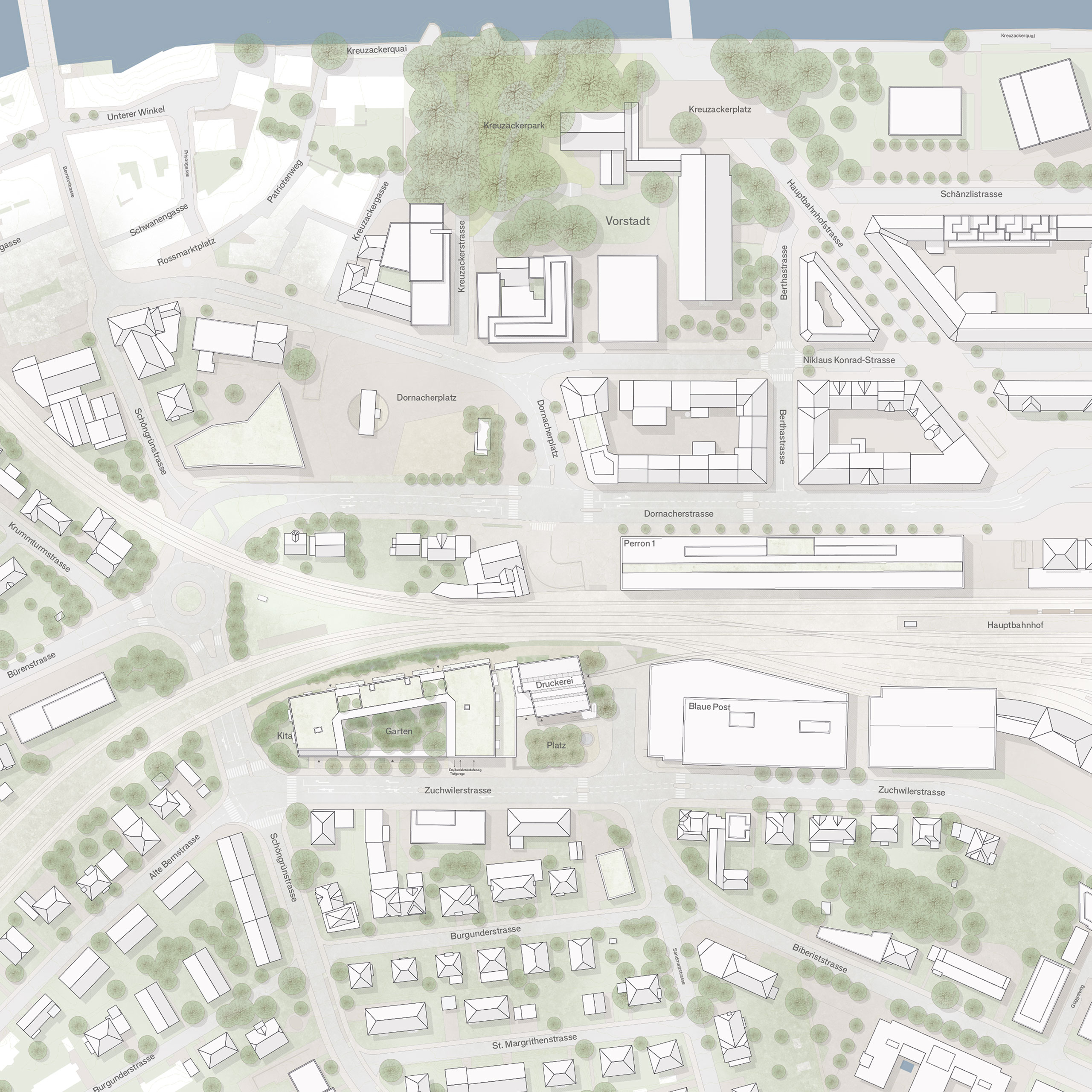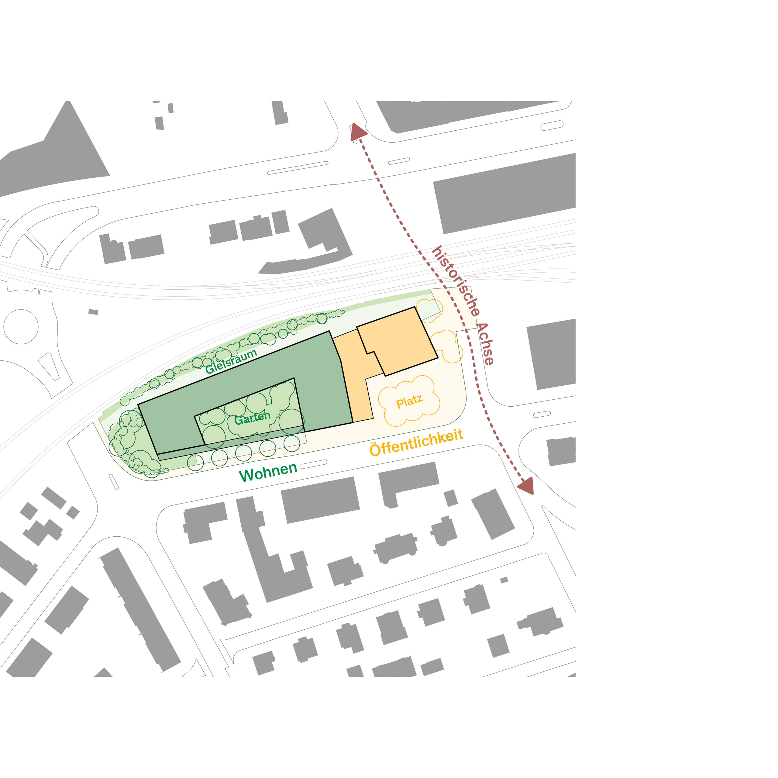 Das Grundstück liegt an der Schnittstelle zwischen Vorstadt und kleinmassstäblichen Siedlungsstrukturen im Süden und gehört zur grossmassstäblichen Bebauung, die sich entlang dem Gleiskörper entwickeln. Das urbane Leben findet jedoch auf der gegenüberliegenden Seite der Geleise statt. Die Verbindung zum Bahnhof und zur Altstadt führt an der südöstlichen Grundstücksecke vorbei. Diese Wegachse war bereits früher sehr wichtig. Hier befand sich im Mittelalter ein Eingang in die Stadtmauern. Auch die Alte Druckerei ist an der Wegachse des ehemaligen Bahnübergangs ausgerichtet. Die Nutzungen der Gebäude, sowie die sozialräumliche Gliederung der Aussenräume orientieren sich an dieser historischen Achse und setzen mit der Trennung von Wohnen und Öffentlichkeit klare Schwerpunkte für die städtebauliche Entwicklung und Anbindungen an die Vorstadt.