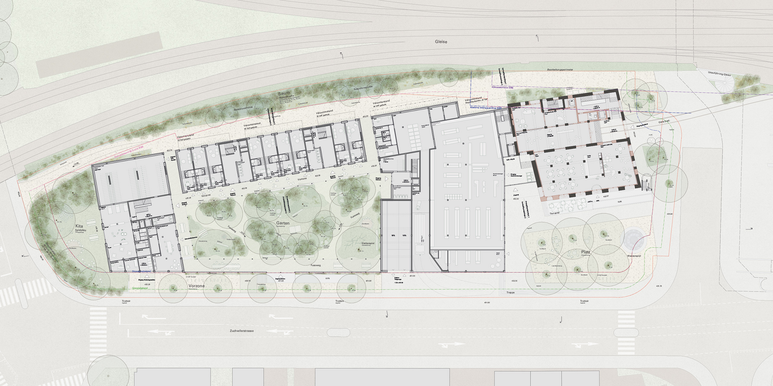 Der rückwärtige Gleisraum wird mit einer neuen Rampe auch zur Schöngrünstrasse angebunden, so dass er Infrastrukturen wie Fahrradunterstände, Feuerwehrzufahrt und aufnehmen kann. Der räumliche Abschluss zum Gleisfeld, wird unter Berücksichtigung der Pflanzabstände zur Bahn, von einer Strauchhecke mit einzelnen Kleingehölzen gebildet.