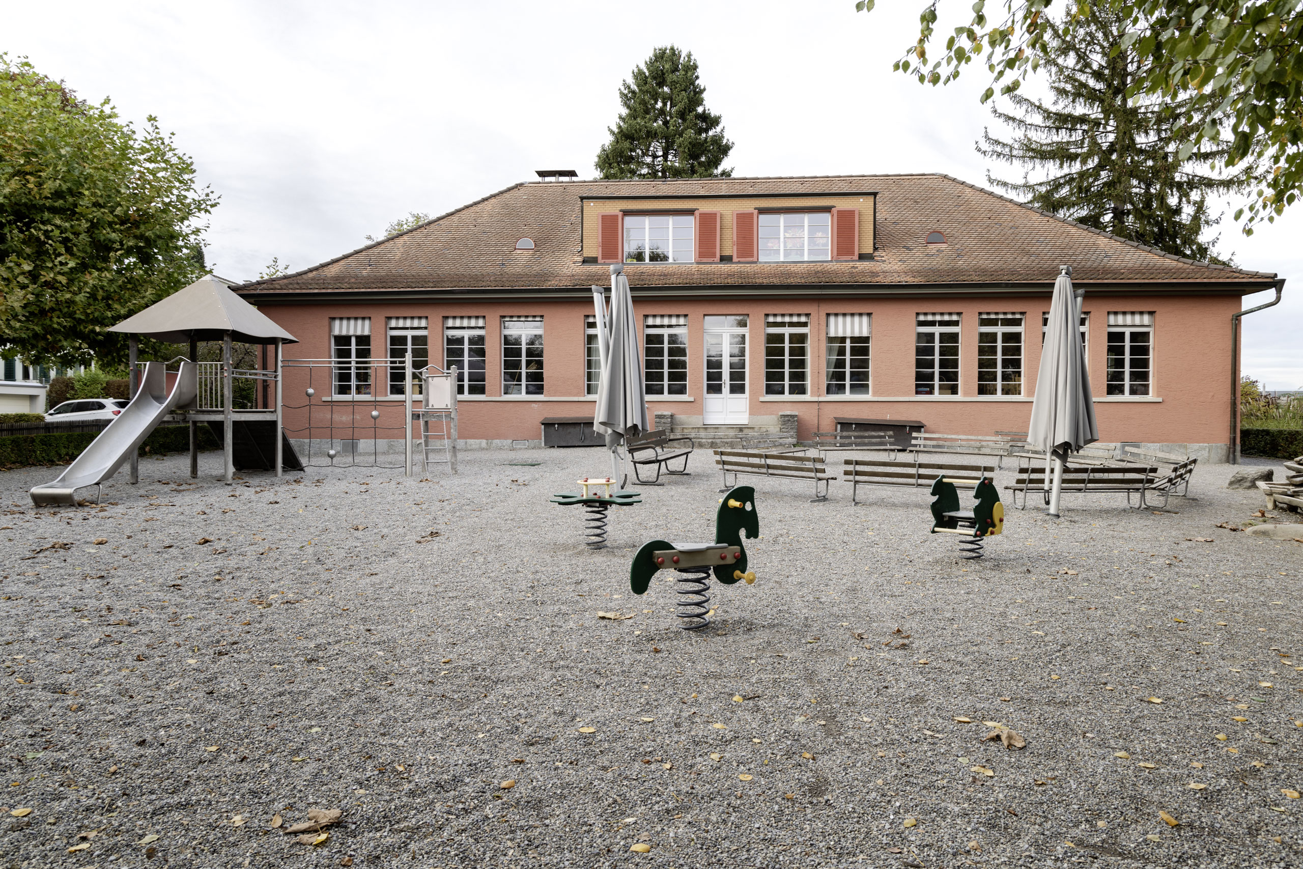 Das nach Süden ausgerichtete Kindergartengebäude besitzt mit seiner grosszügigen und offenen Gartenanlage damals wie heute hohe städtebauliche Qualitäten. Die Anlage ordnet sich selbstverständliche ins Wohnquartier ein und nimmt durch die offene Gestaltung des Gartens eine übergeordnete Stellung im Quartier ein. Die klare Raumgliederung und der Einsatz von wenigen, prägenden Elementen zeichnet die Gestaltung der Gartenanlage aus. Bei der Instandsetzung der Gartenanlage wurden die ursprünglichen Elemente saniert oder erneuert und bisherigen Eingriffe so angepasst, dass sie sich auf selbstverständliche Weise in die einfache Gestaltung der Anlage integrieren.