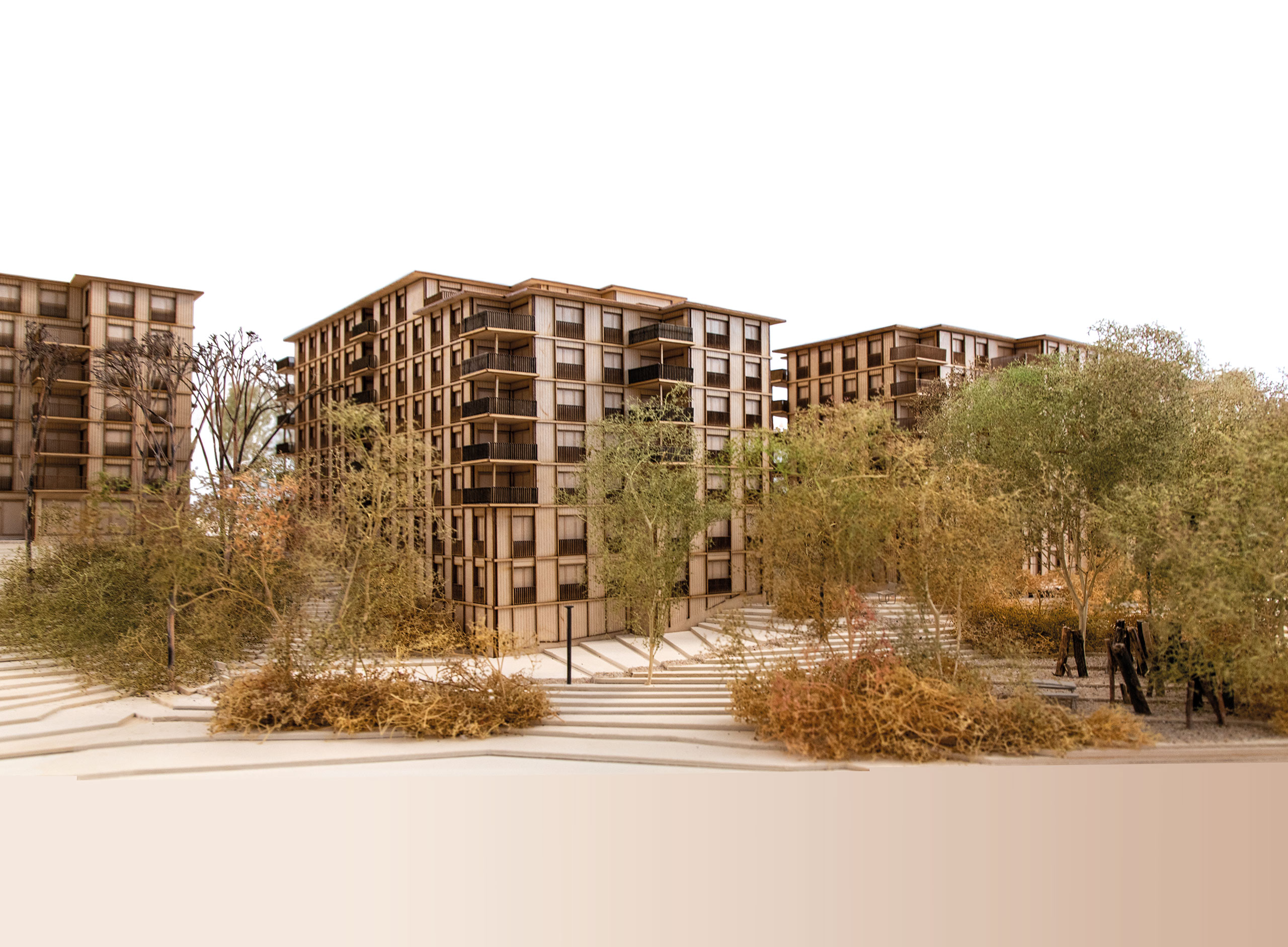 Die Gebäudevolumen reagieren auf die Topographie und den wertvollen Baumbestand. Trotz hoher baulicher Dichte, kann die räumliche Verbindung zum Grünkorridor Neugut aufrecht erhalten, und damit auch die geforderte Kaltlufteinwirkung in den Siedlungskörper von Zürich-Affoltern gewährleistet werden. Durch eine effiziente Erschliessung wird ein hoher Anteil an Grünflächen erreicht, was das unmittelbare Mikroklima wiederum positiv beeinflussen wird.