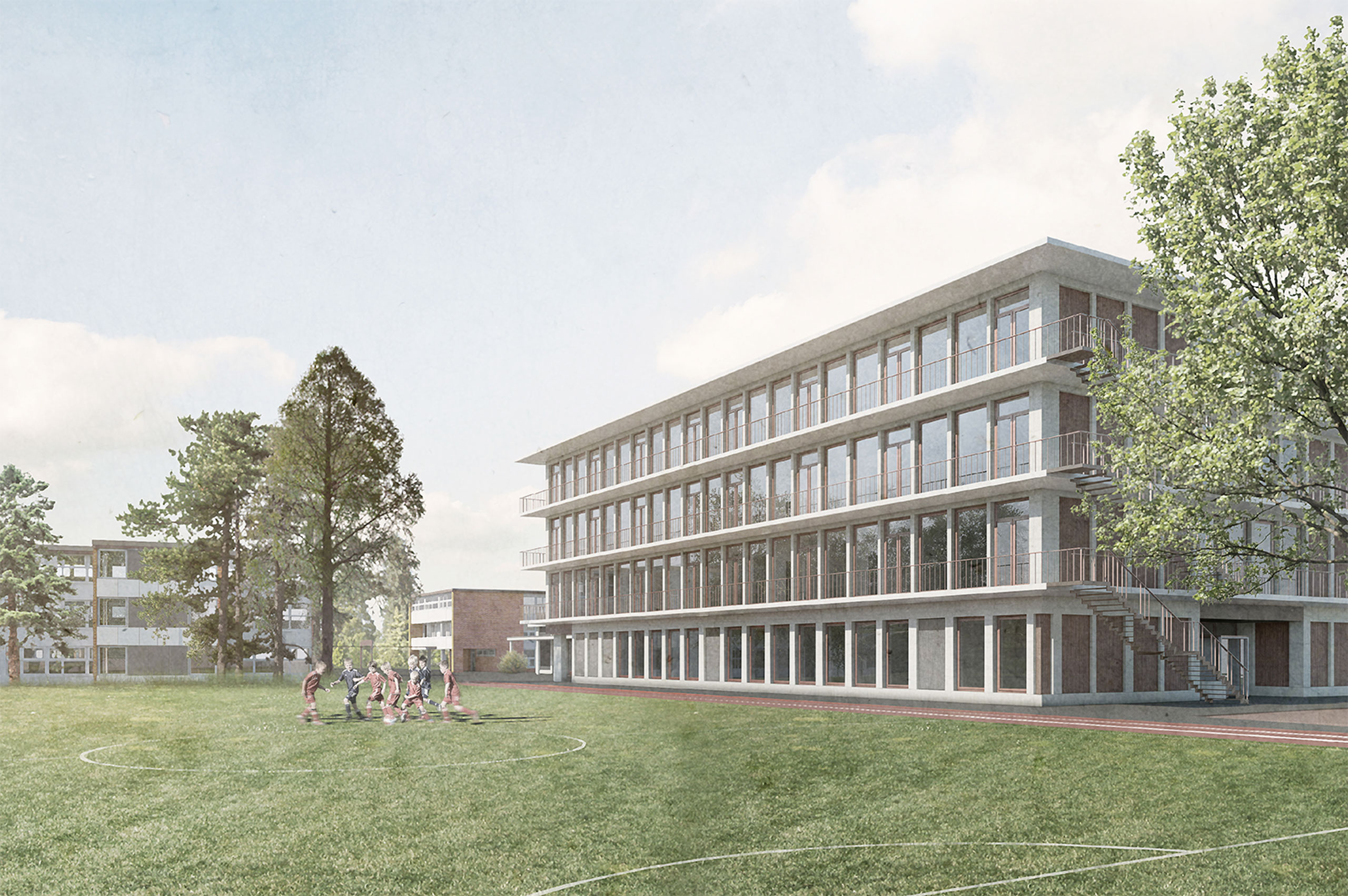 Das Areal der Schulanlage Wolfsmatt ist aufgrund der topographischen Gegebenheiten in zwei Bereiche gegliedert. Die tiefer gelegene weite Ebene und die langgezogene Terrasse über der bewaldeten Böschung zeichnen sich durch unterschiedliche räumliche und atmosphärische Qualitäten aus. Diese Ausgangslage macht sich das Projekt zum Nutzen und bildet eine Schul- und eine unabhängige Hortebene aus.