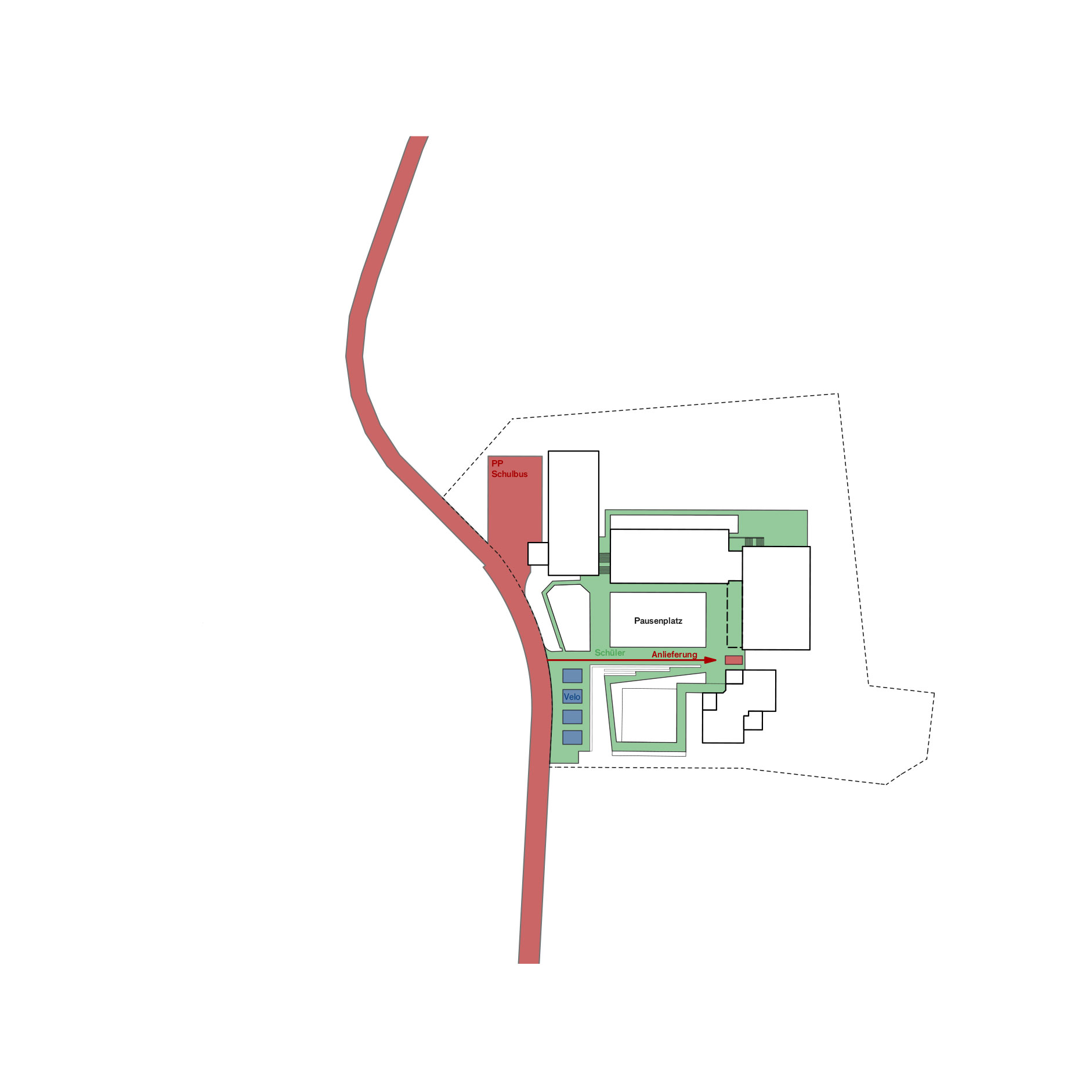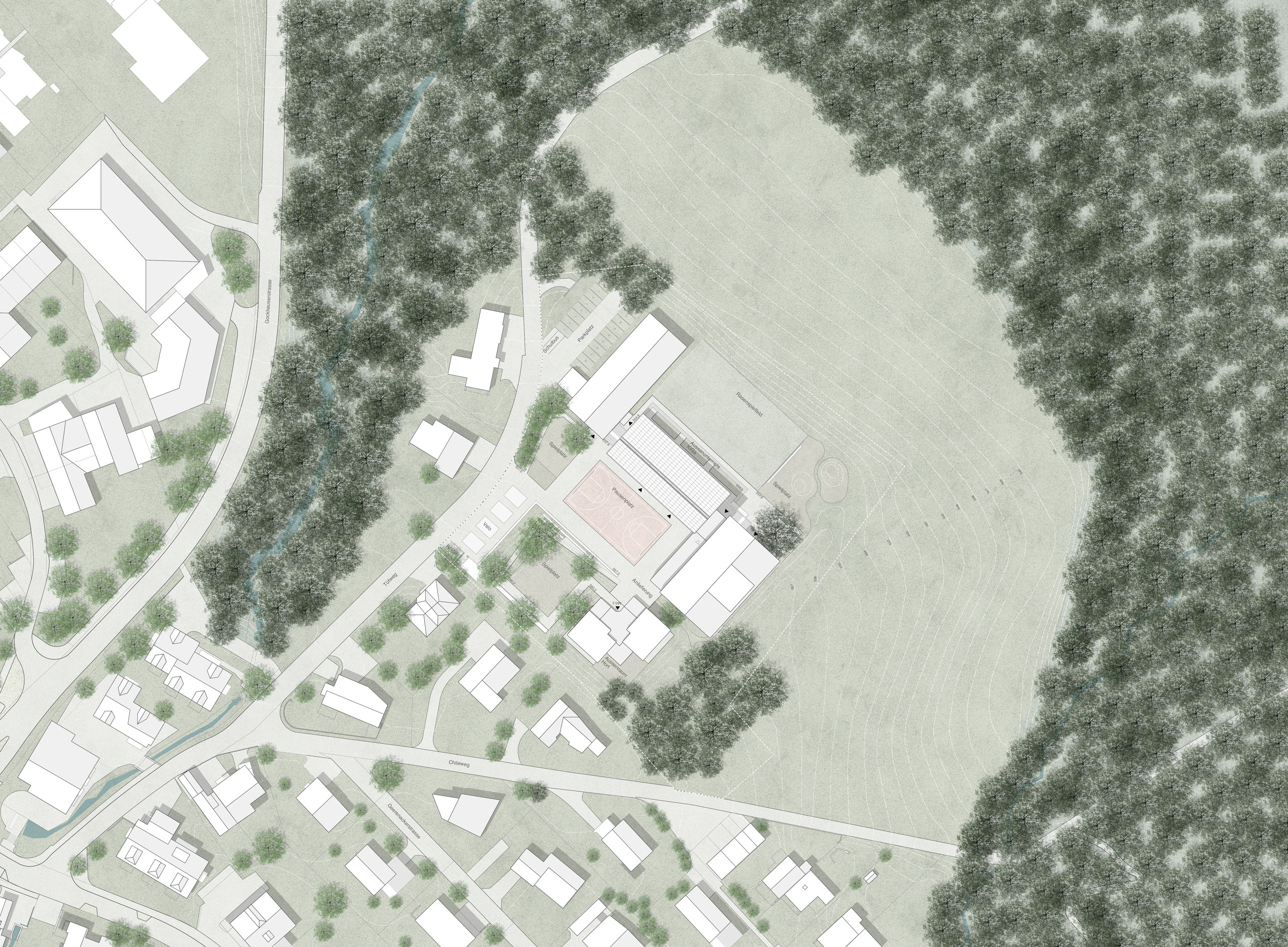 Der Pausenplatz mit dem Allwetterplatz bildet das Zentrum der Anlage. Dazu soll er nach Süden besser gefasst werden. Eine Sitztreppe überwindet den Niveausprung an der Längsseite und vermittelt gleichzeitig zur oberen Ebene. Grössere Bäume führen die Vegetationsstruktur des angrenzenden Einfamilienhausquartier im Spielbereich des Hortes fort und schaffen einen fliessenden Übergang. Die Erschliessung der Schulanlage erfolgt, sowohl für die Schüler, wie auch für den motorisierten Verkehr, über den Tüfweg. Mit der Verlegung der Parkplätze neben die Turnhalle können die Veloabstellplätze beim Hauptzugang positioniert werden und damit eine Entflechtung mit dem motorisierten Verkehr erreicht werden.