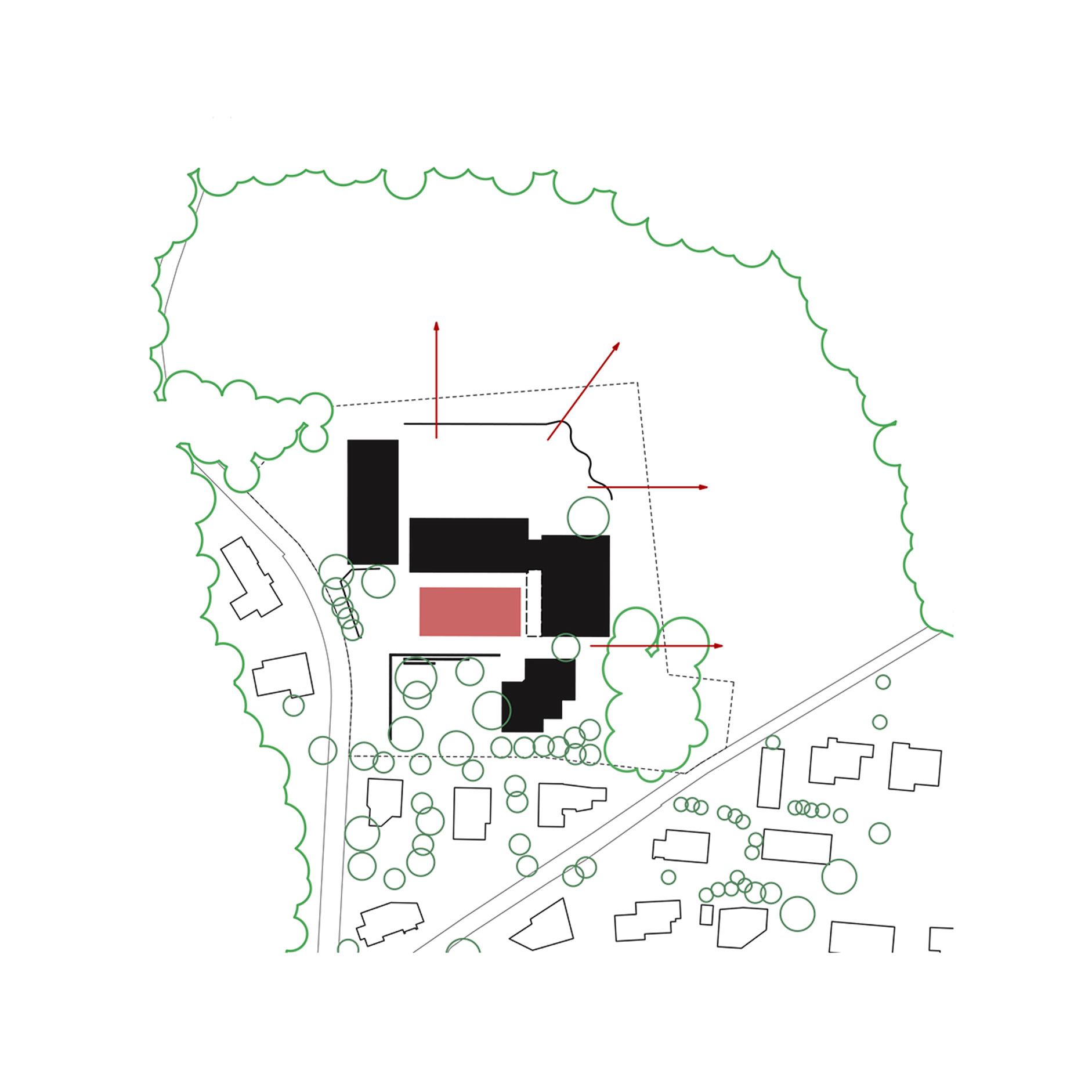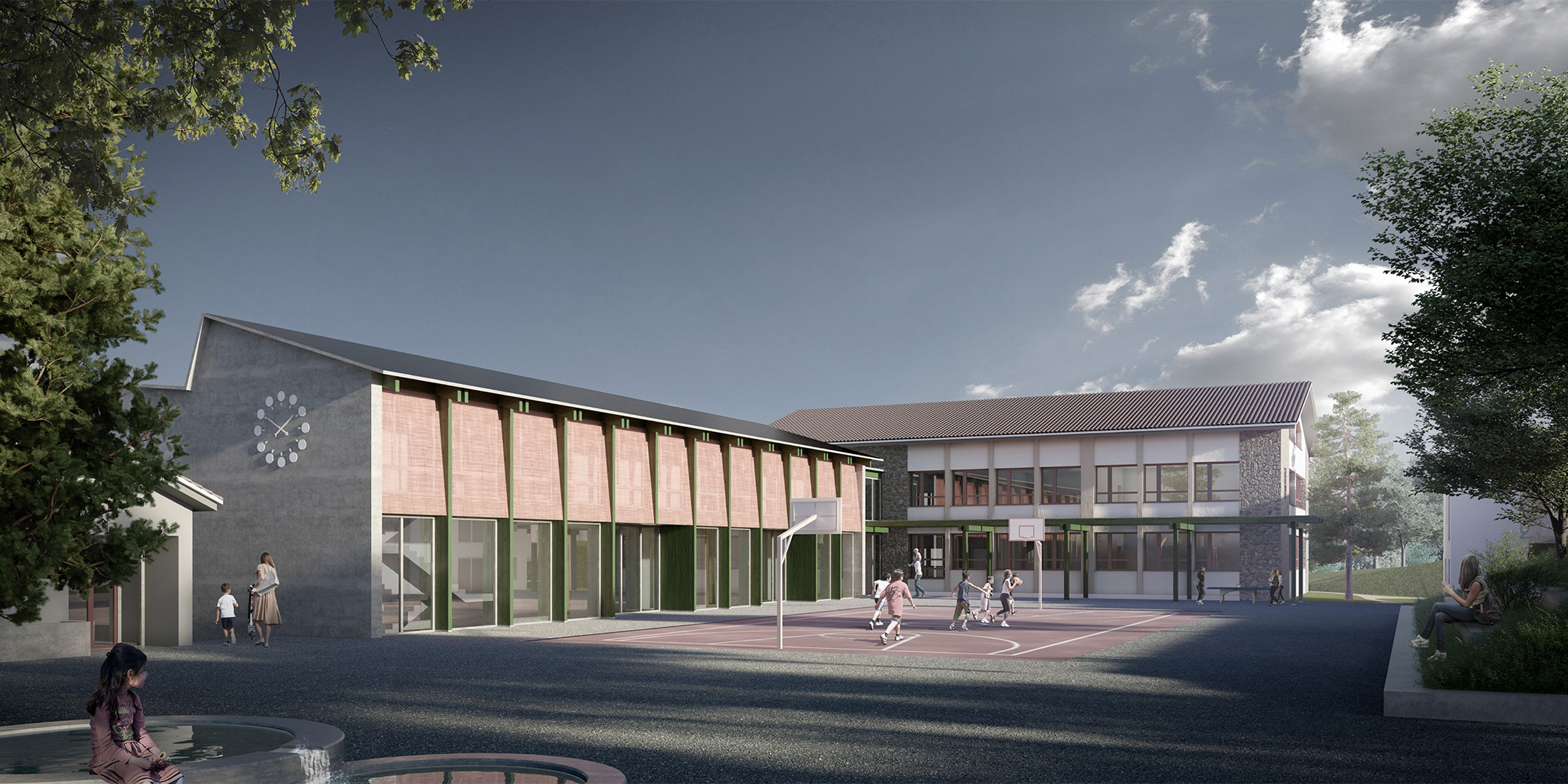 Auf der talseitigen Ebene erhält der neue Kindergarten neben dem bestehenden Rasenspielfeld seine Aussenräume. Neben den unmittelbar an die Klassenzimmer angeordneten Aufenthaltsbereiche wird der Spielplatz auf der äussersten Spitze dieser Geländeterrasse angelegt. Um das landschaftliche Erlebnis der Waldlichtung zu erhöhen, soll die zur Baumhecke herangewachsene Böschungsbestockung zu einer Strauchhecke gepflegt werden.