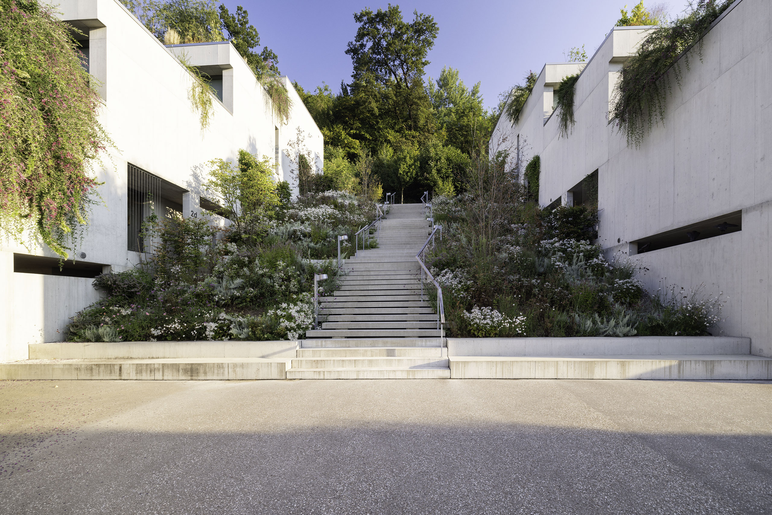 Die Bepflanzung spielt bewusst mit dem Kontrast zur rohen, mineralischen Architektur und bettet die Siedlung damit in die von Wiesen und Wäldern geprägten Landschaftsraum ein. Sämtliches Meteorwasser wird in offen geführten Rinnsalen in kleine Teiche oder Mulden geführt und an Ort versickert und ist sowohl ein ökologisch als auch gestalterisch wertvolles Element, das dem Ort eine zusätzliche Dynamik verleiht.