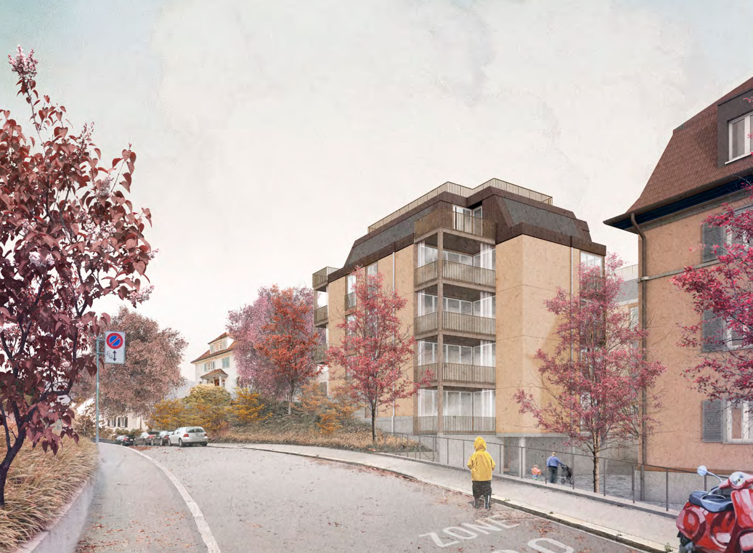Die beiden freistehenden Ersatzneubauten führen das vorherrschende Bebauungsmuster auf dem abfallenden Hügelzug fort. Sie verzahnen sich mit der Gründungssiedlung und bilden ein Ensemble mit einem zentralen Hof und Grünfläche als Übergang zu den angrenzenden Wohnbauten.