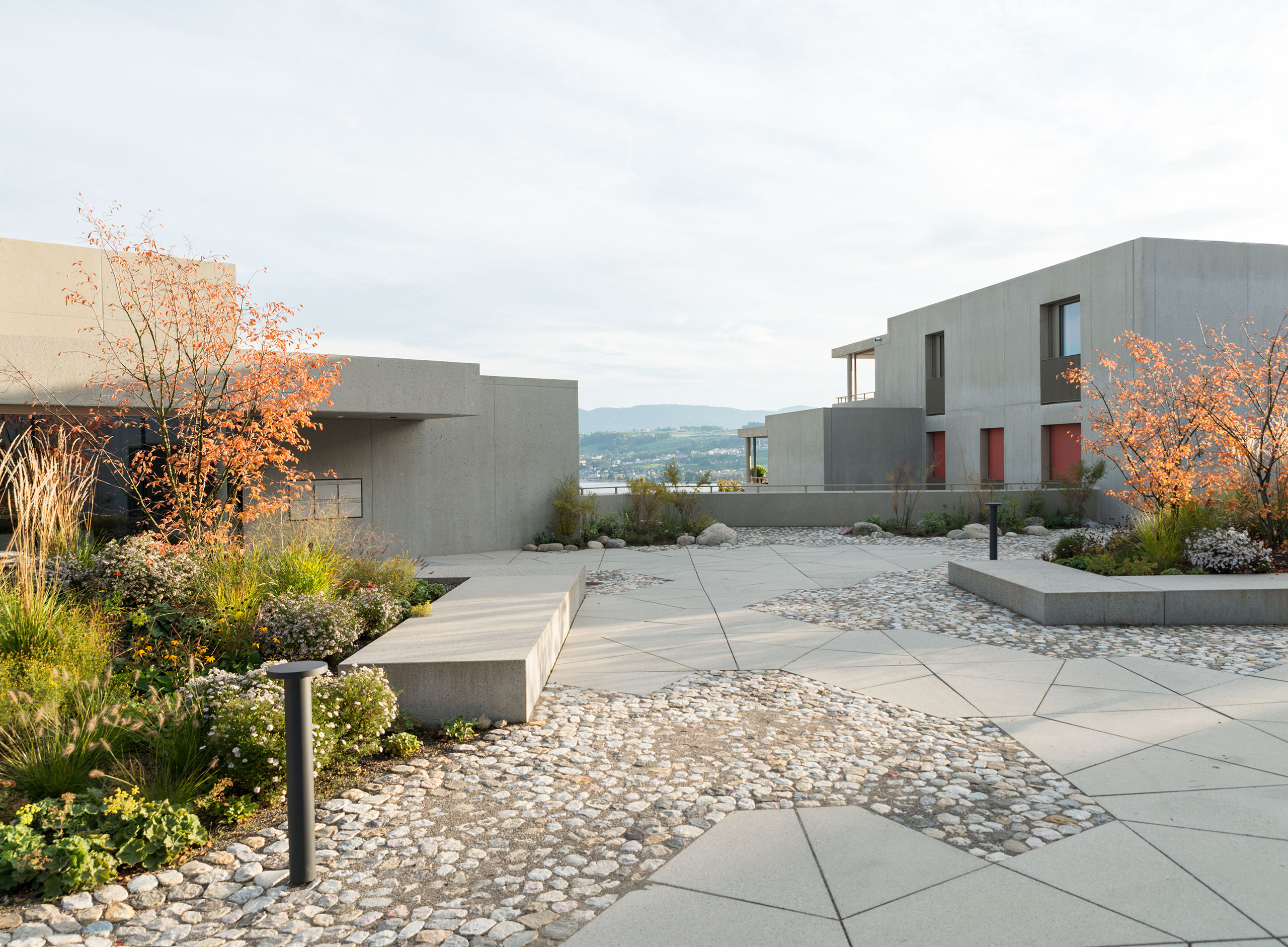 Es war das erklärte Ziel, dass der zentrale Hof den Charakter eines gepflegten Gartens vermittelt und als Ort der Ankunft und Begegnung eine hohe Privatheit ausstrahlt. Das Bild eines mitteleuropäischen Gartens, wo Wege durch üppiges Grün führen, kann die betrieblichen Anforderungen jedoch nicht einlösen. Mit der realisierten Form wird dieser Garten mit seiner gepflegten und klimagerechten Mediteranität der Lage mit aussergewöhnlicher Aussicht, der exklusiven Wohnform und den Sicherheitsaspekten gerecht. Der äussere grüne Saum wird vom Charakter, der auf dem Grundstück vorgefundenen Streuobstwiese bestimmt. Der grosszügige und offene Raum verleiht den nach Süden ausgerichteten Wohnräumen und Terrassen eine ruhige Atmosphäre und schafft einen direkten Bezug zum Ort und versucht dem aussergewöhnlichen Panorama und der Weitsicht eine zweite Dimension entgegen zu setzen.