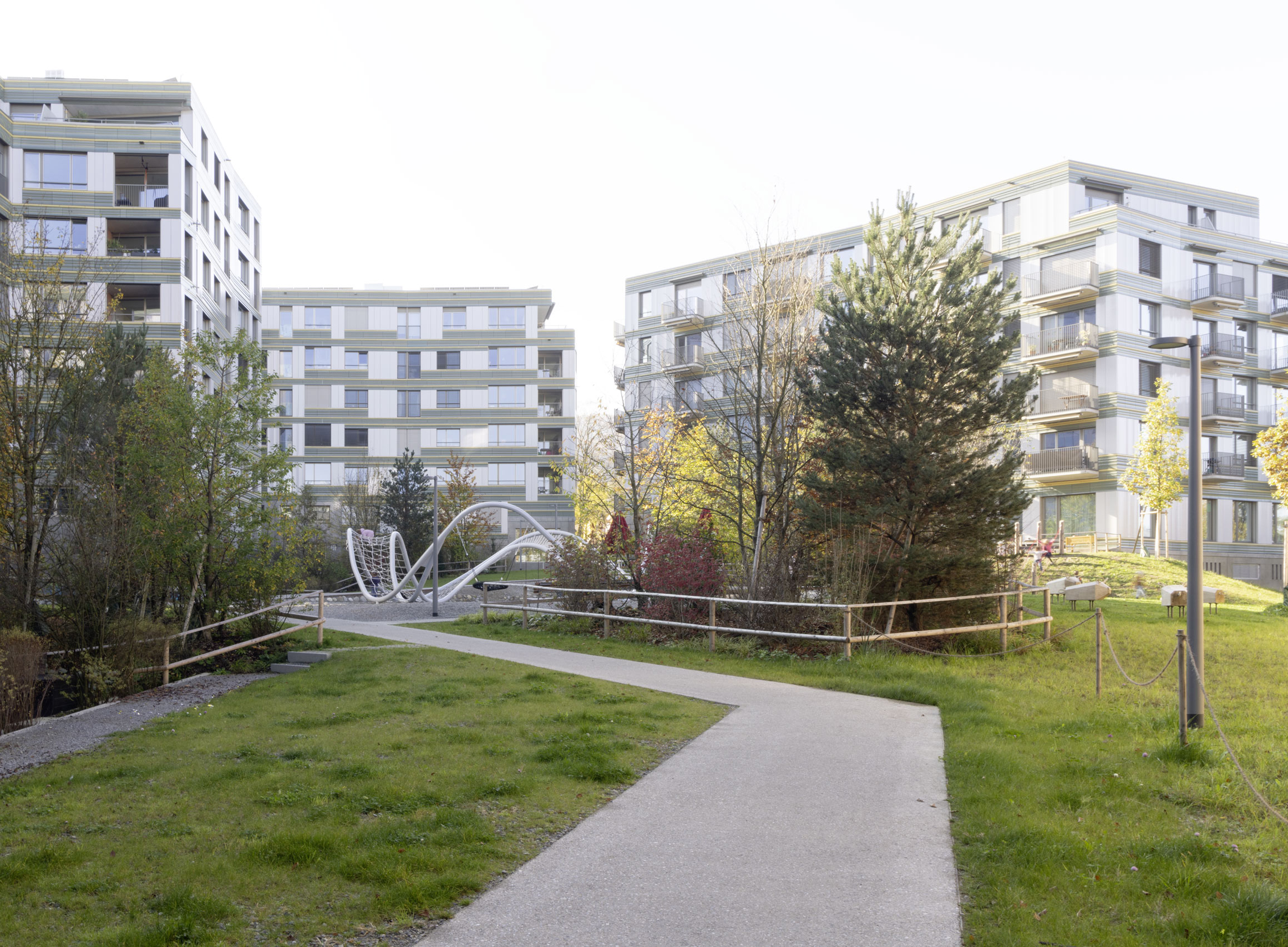 Die vier neuen Wohngebäude bilden einen zweiseitig gefassten Hof, der zum Tal hin offenbleibt. Die Anbindung ans Quartier erfolgt über einen Vorplatz am Wydäckerring. Im Hofraum wird die Wohnsiedlung durch ein schollenartiges Wegenetz zu einer Einheit zusammengebunden. Die einzelnen Schollen sind mit verschiedenen Nutzungen programmiert und unterscheiden sich in ihrer Materialität und Ausstattung. Dichte Baumgruppen oder Kleinstwälder gliedern den Hofraum und schaffen mit dem weit verzweigten Wegenetz eine parkähnliche Atmosphäre.